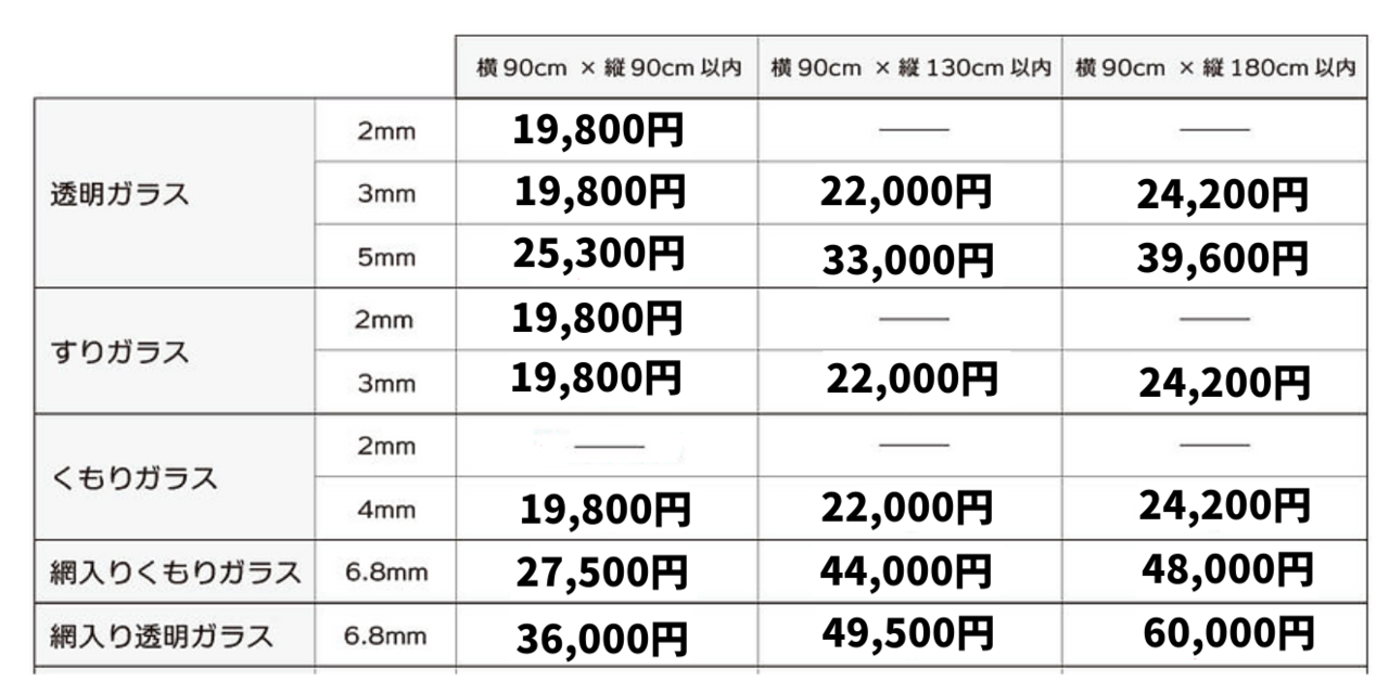 割れたガラスはとても危険です。ガラスの厚みがわからない場合は当社が家の状況をヒアリングして多種のお値段をご連絡します。