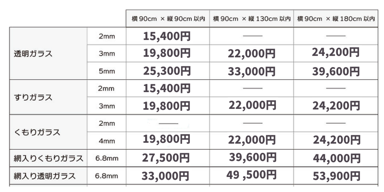規格内ガラスサイズとは料金表に掲載しているサイズです。